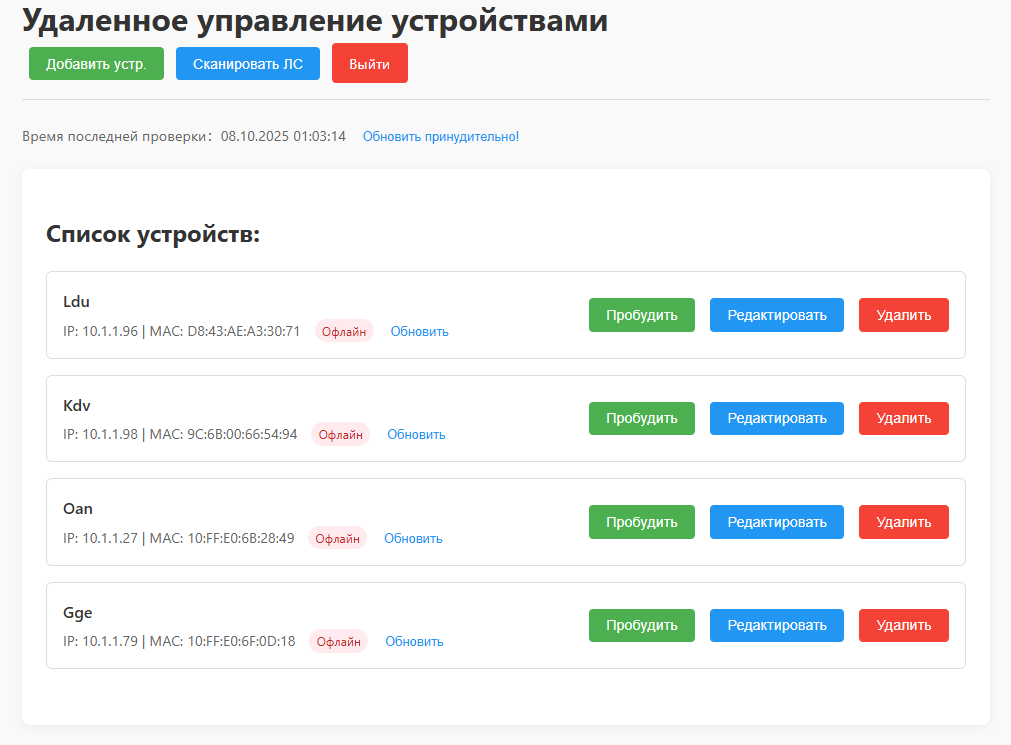 Дождитесь включения компьютера, проверьте, чтобы статус устройства изменился на “Онлайн” допускается принудительно запустить проверку статуса, нажав кнопку обновить “Обновить” рядом с устройством